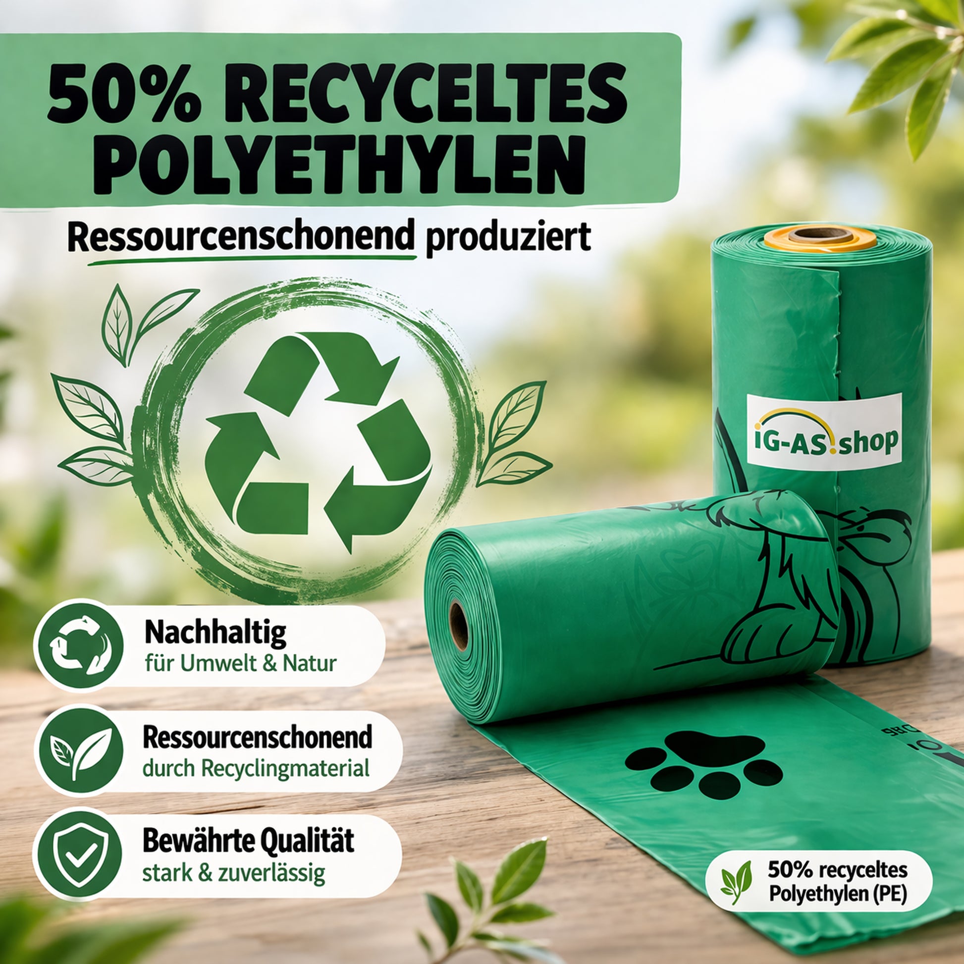 Unsere Hundekotbeutel bestehen zu 50 % aus recyceltem Polyethylen – ein bewusster Schritt für weniger Neukunststoff und mehr Kreislaufwirtschaft. Gut für deinen Hund. Gut für die Umwelt.